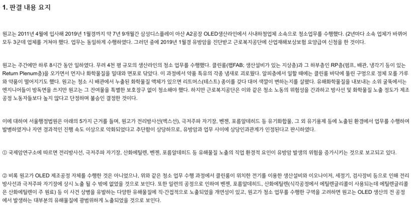 서울행정법원은 지난 11월 26일(2021구단79899) “원고가 OLED 생산라인 클린룸과 하부 RP층을 오가며 수행한 청소 업무 특성상 전리방사선, 극저주파 자기장, 벤젠, 포름알데히드, 산화에틸렌 등 유해물질에 상시 노출될 수밖에 없었다”며 “유방암 발병과 업무 사이에 상당인과관계가 인정된다”고 판단했다.