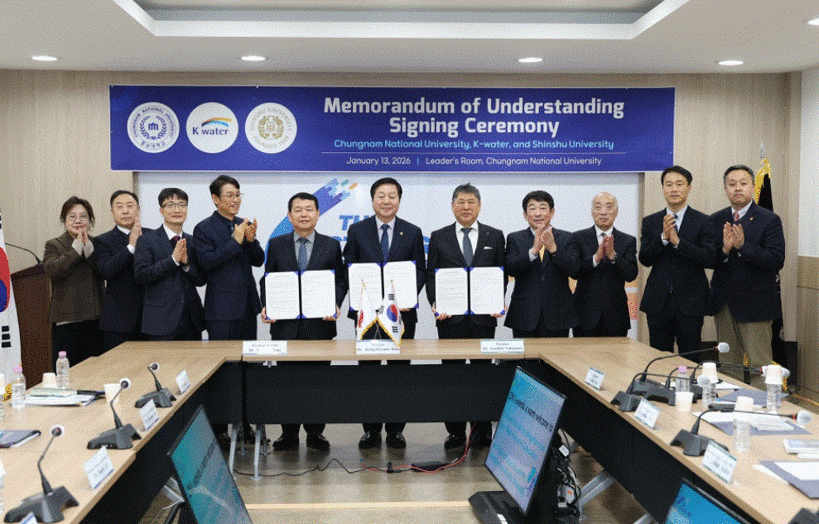 [일요주간 = 엄지영 기자] 한국수자원공사(K-water)는 1월 13일 대전 충남대학교에서 충남대학교, 일본 신슈대학교와 물 분야 기술 발전과 인재 양성을 위한 업무협약(MOU)을 체결했다. 이번 협약을 통해 기후위기 대응을 위한 첨단수처리와 물·에너지 융합 분야의 국제 공동연구와 인재 교류를 본격 추진한다.