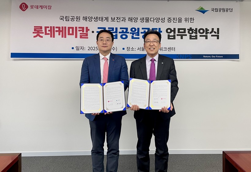[일요주간 = 엄지영 기자] 롯데케미칼은 3일 국립공원공단과 함께 서울 마포구 국립공원공단 스마트워크센터에서 ‘국립공원 해양 생태계 보전과 생물다양성 증진을 위한 업무협약’을 체결했다. 협약식에는 김영번 롯데케미칼 커뮤니케이션부문장과 최종원 국립공원공단 자원보전이사가 참석했다.