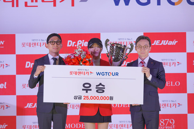 | ▲ 지난 8일 골프존조이마루에서 열린 '2026 롯데렌터카 WGTOUR’ 3차 메이저대회 시상식에서 (왼쪽부터) 골프존 안희훈 사업부장, 우승자 이진경, 롯데렌탈 주식회사 조근행 상무가 기념사진을 촬영하고 있다. (사진=골프존 제공) |