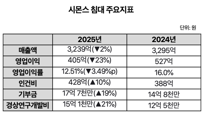 수면 전문 브랜드 시몬스(대표 안정호)가 소비 침체와 원가 상승 등 대외 악재 속에서도 지난해 매출 3239억 원을 기록하며 3년 연속 침대 업계 1위 자리를 굳건히 지켰다. 단기적인 수익성 하락에도 불구하고 R&D 투자와 기부금을 대폭 늘린 시몬스는 ‘품질 경영’과 ‘사회적 책임’이라는 업의 본질에 집중하며 독보적인 프리미엄 입지를 공고히 했다.