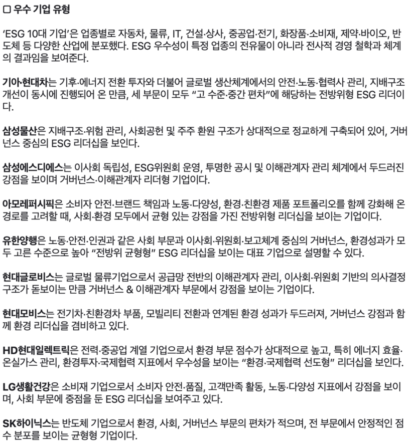 이번 평가 결과에 따르면 ESG 우수성은 특정 업종에 국한되지 않고 자동차, IT, 제약, 중공업 등 산업 전반에 걸쳐 고르게 나타났다. 이는 ESG 경영이 업종의 특성을 넘어 전사적인 경영 철학과 시스템으로 자리 잡고 있음을 보여준다.