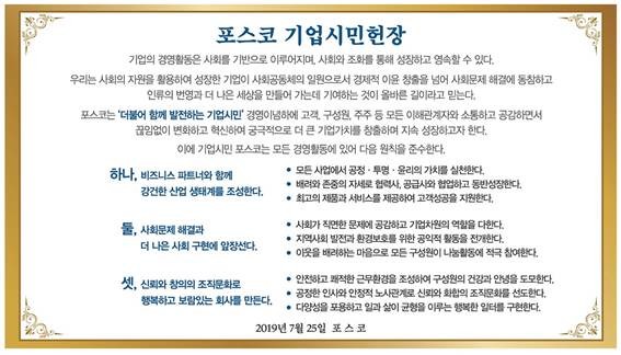 [일요주간 = 조무정 기자] 굴지의 철강 대기업 포스코는 2018년 3월 최정우 회장이 취임하면서 '더불어 함께 발전하는 기업시민'이라는 경영이념을 선포했다. 이를 실천하기 위해 포스코는 ‘기업시민헌장’을 제정했는데 그 내용을 살펴보면 ‘하나, 비즈니스 파트너와 함께 강건한 산업 생태계를 조성한다’, ‘둘, 사회문제 해결과 더 나은 사회 구현에 앞장선다’, ‘셋, 신뢰와 창의의 조직문화로 행복하고 보람있는 회사를 만든다’이다. 이와 함께 고객, 구성원, 주주 등 모든 이해관계자와 소통하고 끊임없이 혁신해 더 큰 기업가치를 창출하기 위해 노력할 것을 천명했다.