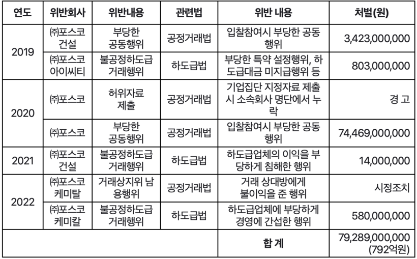 포스코가 최근 5년 간 공정거래법 및 하도급법 위반으로 공정위로부터 부과받은 과징금은 총 792억 원이다. 위반내용은 관련법에서 불공정행위로 규정하고 있는 부당한 공동행위, 하도급대금 미지급, 거래상대방에게 불이익을 준 행위 등이다.