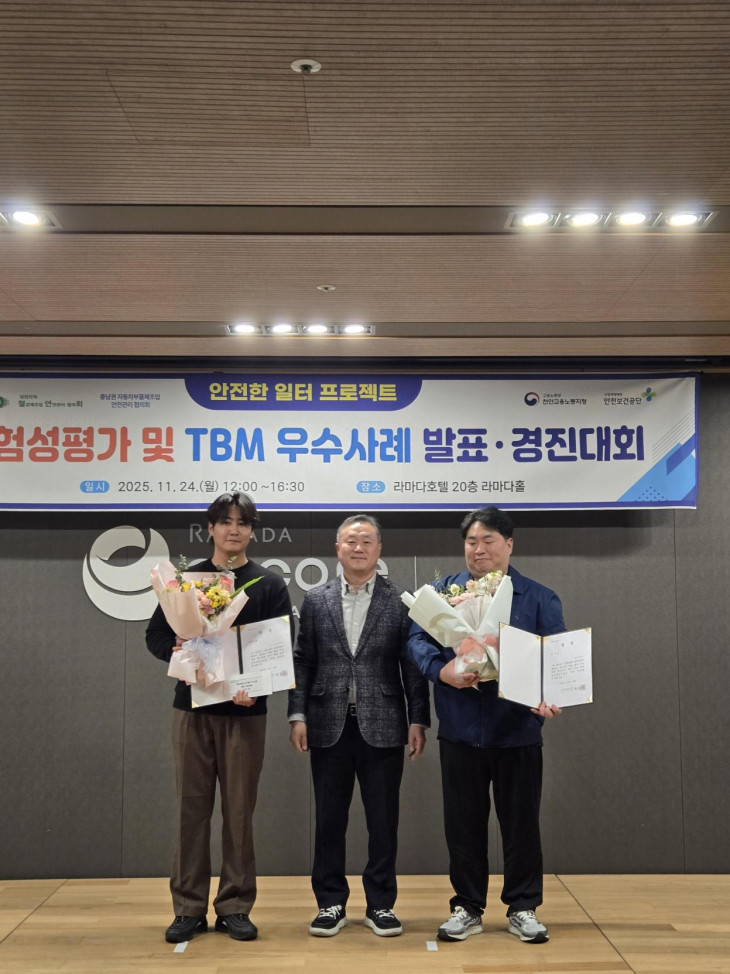 고용노동부 천안지청과 안전보건공단 충남지역본부가 주관한 ‘안전한 일터를 위한 위험성평가 및 TBM 활동 우수사례 발표·경진대회’가 11월 24일 천안 라마다호텔에서 개최됐다. 이번 행사에는 충남지역 자동차부품제조업·철강업 안전관리 협의회 회원사 46개 기업이 참석했으며, 예선을 통과한 16건의 우수사례가 본선 무대에서 발표됐다.