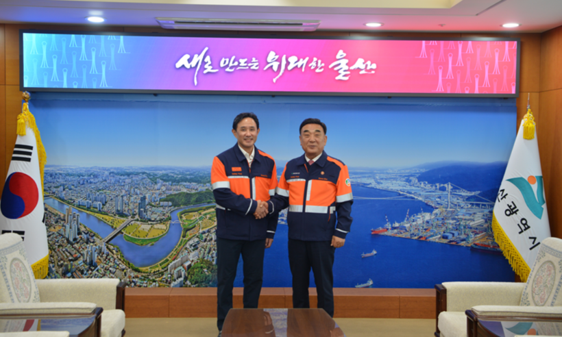 | ▲ 최윤범 고려아연 회장(좌)이 17일 울산시를 방문해 김두겸 시장을 만나 미국제련소 건설과 채용 확대 계획, 온산제련소와 시너지 등을 설명했다. (사진=고려아연 제공) |