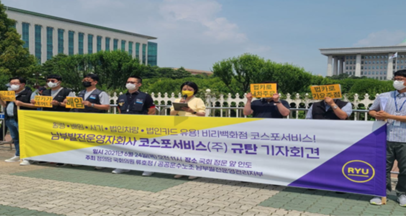 | ▲정의당 류호정 의원과 공공운수노조는 24일 오전 국회 정문 앞에서 한국남부발전 자회사 코스포서비스(주)에 대한 감사결과를 발표하는 기자회견을 열었다.(사진=공공운수노조 제공) |