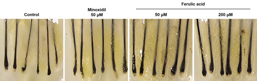 우선 인체 모낭 배양 결과 페룰릭산-NMN 조합은 모유두세포의 증식과 미토콘드리아의 기능 활성에 도움을 주는 것으로 확인됐다. 미토콘드리아는 모유두세포의 에너지 대사를 촉진하여 새로운 모발 생성에 매우 중요한 역할을 한다. 또한 페룰릭산-NMN 조합은 배양 모낭을 통한 실험에서 대표적인 모발 강화 성분인 ‘미녹시딜’보다 높은 모발 성장기 유지율을 보여주기도 했다.
