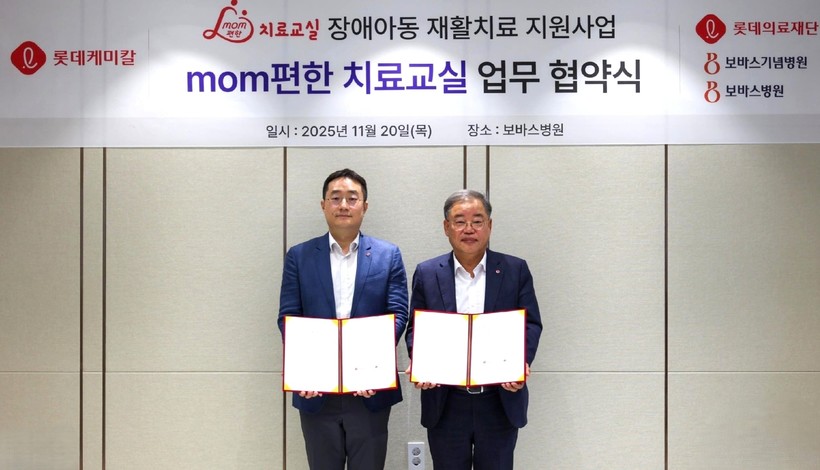 양측은 20일 하남 보바스병원 어린이재활센터에서 장애 아동을 위한 사회공헌 프로그램 ‘mom편한 치료교실’ 운영을 골자로 한 업무협약을 체결했다고 21일 밝혔다. 협약식에는 김영번 롯데케미칼 커뮤니케이션부문장과 김천주 롯데의료재단 이사장, 박종우 사무국장, 윤연중 보바스병원장 등 관계자들이 참석했다.