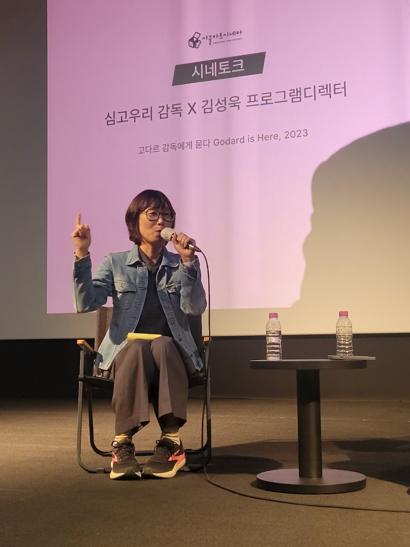▶ 고다르 감독 타계 3주기 특별전은 제가 기획한 것은 아니지만 제가 더숲아트시네마에 2년 전 전주국제영화제에서 소개되었던 다큐영화 <고다르 감독에게 묻다>를 제안한 것은 맞습니다. 마침 3주기를 맞아 기획이 이루어졌고 숲아트시네마 영화관에 상영권이 있는 고다르 감독 영화 중에서 한국 관객에게 잘 알려지지 않은 “국외자들” (Bande à Part)를 추천했고 같은 날 이어서 상영할 수 있어서 좋았습니다. 제 다큐는 고다르 감독 생전에 영화의 제작과정에 대해 질문하는 인터뷰 영화인데 한국인으로서 직접 만나 인터뷰를 진행한 사람은 저밖에 없어서 유일한 사례로 남게 되었습니다. 인터뷰를 통해 영화를 만드는 여러 과정에 관한 얘기와 한국 관객에게 고다르 감독 특유의 영화제작 방식이 주는 난해한 느낌을 풀어보며 작품으로의 접근성을 고취해 본다는 취지로 시작되었습니다. 2001-2002년 당시 저는 서울에서 고다르감독 회고전을 준비하며 인터뷰 영화를 함께 소개하려고 했지만 성사되지 못해 아쉬움이 있었어요. 그러나 20여 년이 지나 새로운 관객을 만나게 되어 정말 다행입니다. 지난 10월 서울 숲아트시네마 상영 후, 서울아트시네마의 초청으로 11월 4일부터 11일까지 간 세 차례에 걸친 상영과 특히 11월 4일 상영회에 이어 관객과의 만남이 있었습니다.