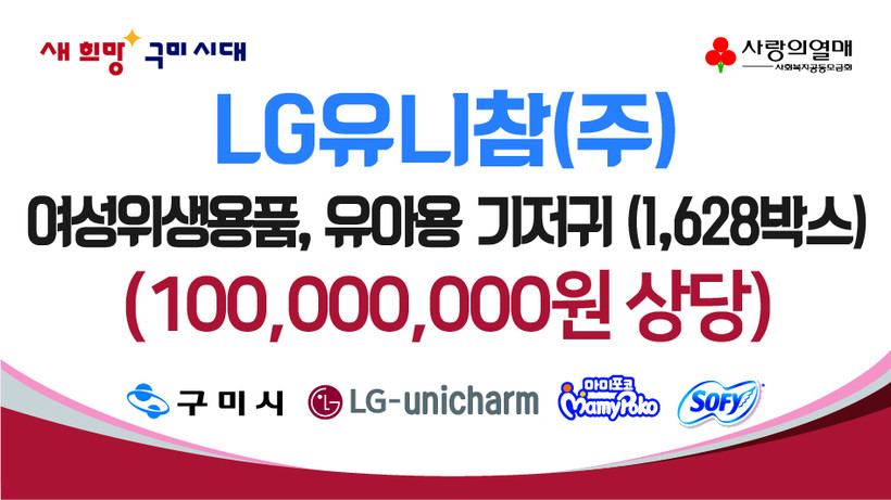 LG유니참은 7일 제품 생산 공장이 위치한 경북 구미의 지역사회 활성화를 위해 경제적인 어려움을 겪는 취약계층을 대상으로 생리대와 유아 기저귀 약 34만 매의 위생용품을 전달했다.