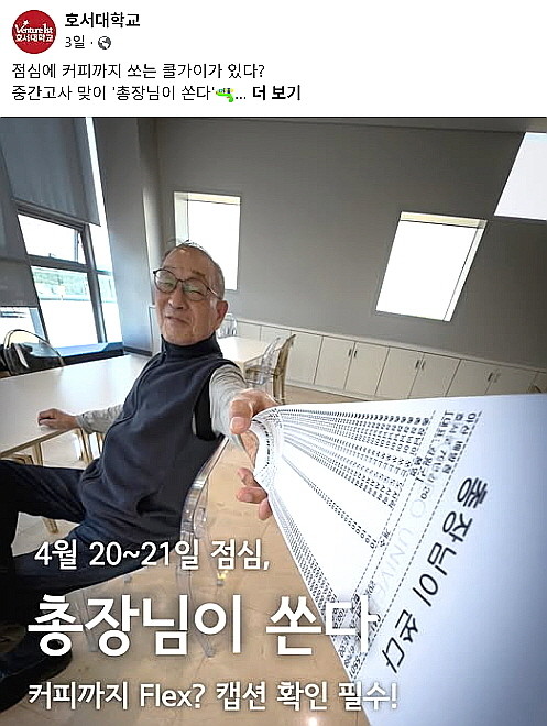 | ▲ 호서대 공식 소셜미디어에 게시된 ‘총장님이 쏜다’ 홍보 이미지. (사진=호서대학교 제공) |