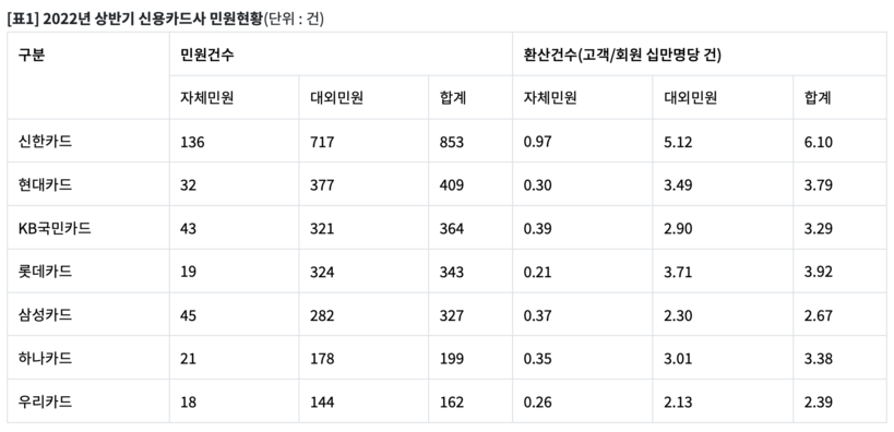 소비자주권시민회의에 따르면 신한카드는 자체민원·대외민원도 다른 카드사에 비해 압도적으로 많았는데 자체민원은 최대 7배, 대외민원은 최대 5배 이상 차이가 났다.
