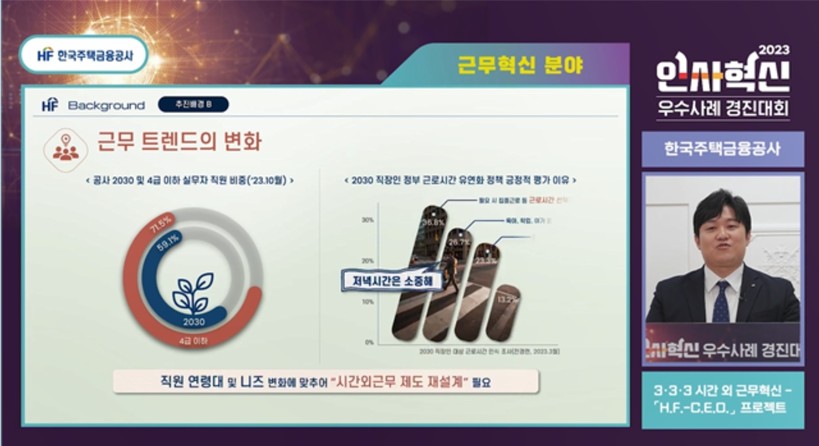 HF공사의 우수사례 ‘3·3·3 시간외근무 혁신 - H.F.-C.E.O. 프로젝트’는 ▲정당한 시간외근무 보상을 위한 제도개선 ▲이석관리 시스템 자체개발 ▲시간외근무 한도운영 관련 개편 등을 주요내용으로 하고 있으며, 일하는 방식을 개선하여 생산성을 높이고 근로시간 선택권을 확대하는 등 유연한 근무형태 확산에 기여했다는 평가를 받았다.