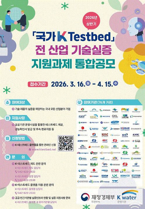 한국수자원공사(K-water, 사장 윤석대)는 ‘2026년 상반기 국가 K-테스트베드 통합공모’를 통해 3월 16일부터 4월 15일까지 국가 K-테스트베드 공식 누리집(www.ktestbed.net)에서 참여기업을 모집한다.