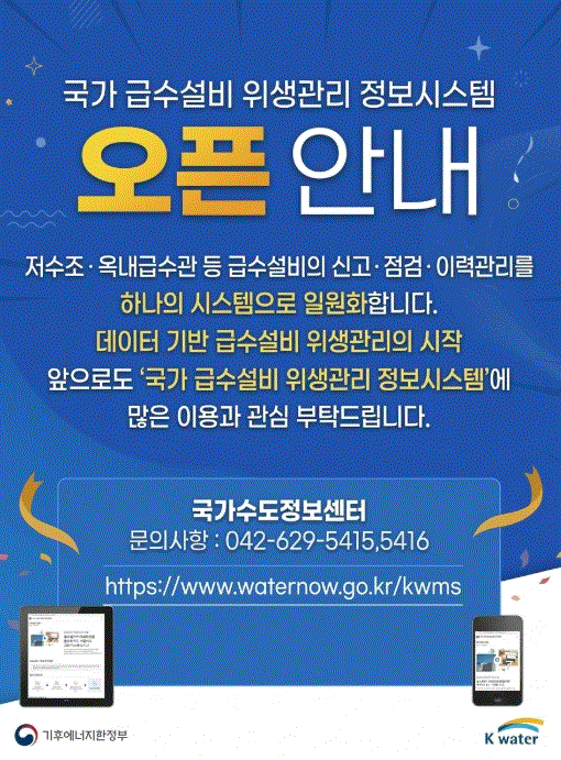 한국수자원공사(K-water, 사장 윤석대)는 기후에너지환경부 대행 사업의 일환으로 구축한 ‘국가 급수설비 위생관리 정보시스템’을 4월 1일 정식 개시하고 이날부터 대국민 서비스를 시작한다고 밝혔다.