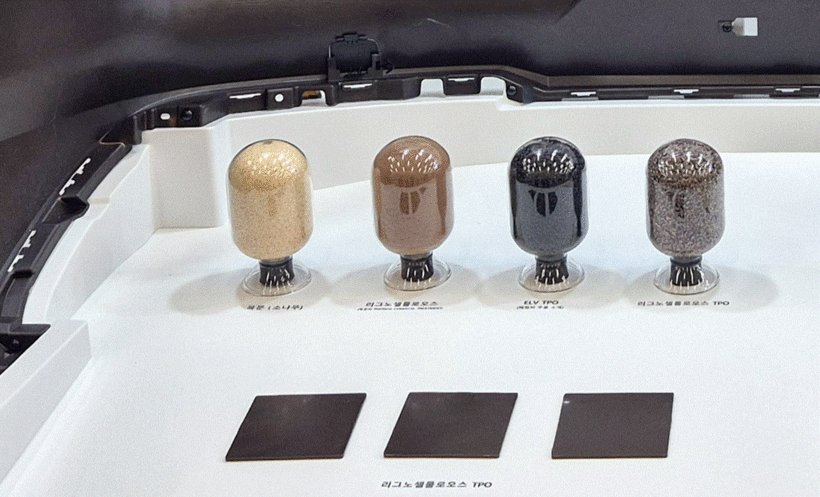 현대모비스는 목재를 가공한 ‘리그노셀룰로스’라는 바이오 소재를 업계 최초로 적용할 방침이다. 목재를 분쇄해 물리화학적 처리를 거쳐 특정 성분만 추출하는 방식이다. 이후 다른 재료와 혼합해 범퍼커버와 같은 플라스틱 부품이나 고무제품을 만들 수 있다. 국내에서는 흔한 소나무를 사용한다.