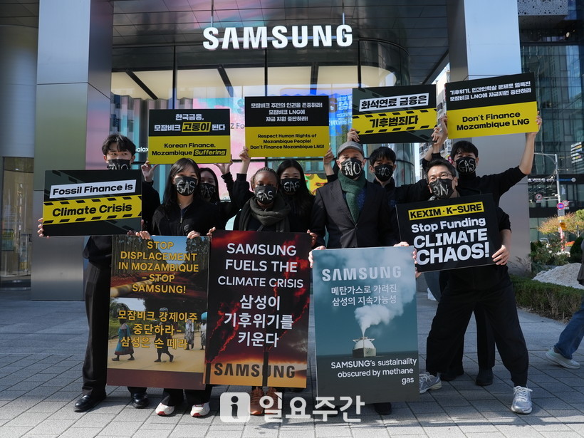 | ▲ 지난 23일 서울 서초구 강남대로 삼성전자 본사 앞에서 모잠비크 시민단체 JA와 국내 단체 기후솔루션이 공동 기자회견을 열고 삼성중공업의 모잠비크 가스전 사업 참여를 규탄했다. (사진=기후솔루션 제공) |