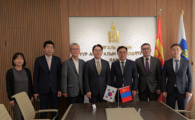 ▲ 유한킴벌리 대표이사 사장(좌측에서 네번째), 바트바타르 바트 몽골 환경기후변화부 장관(우측에서 세번째), 김재현 평화의숲 대표(좌측에서 세번째), 오윤사나 몽골 산림청장(우측에서 두번째) 등이 지난 3일 울란바토르에서 열린 면담에서 기념촬영을 진행하고 있다.(사진=유한킴벌리) |