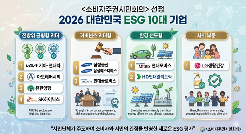 소비자주권시민회의는 21일 국내 100대 상장기업을 대상으로 실시한 ESG 평가 결과를 바탕으로 ‘2026 대한민국 ESG 10대 기업’을 선정해 발표했다.
