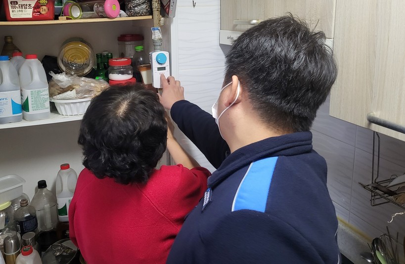| ▲ 삼천리 직원이 취약계층에 가스타이머콕을 설치하고 있다.(사진=삼천리) |