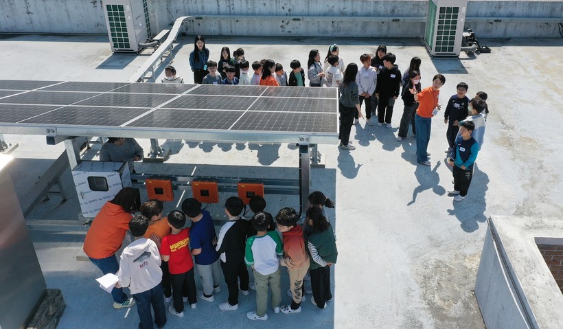 ▲ 대구 신흥초등학교 학생들이 맑은학교 만들기를 통해 건물 옥상에 설치된 태양광 설비를 살펴보고 있다.(사진=한화그룹) |