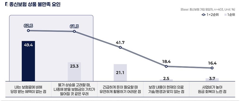 조사 결과, 응답자의 절반가량(49.4%)이 종신보험의 가장 큰 불만으로 ‘생전 혜택 부재’를 꼽았다. 이어 ‘보험금 가치 하락’(23.3%), ‘유연한 활용 어려움’(21.1%) 순으로 나타나, 종신보험이 여전히 가족 사랑과 책임을 상징하지만 비싼 보험료와 비유동성 자산이라는 인식이 강하게 자리잡고 있음을 확인했다.