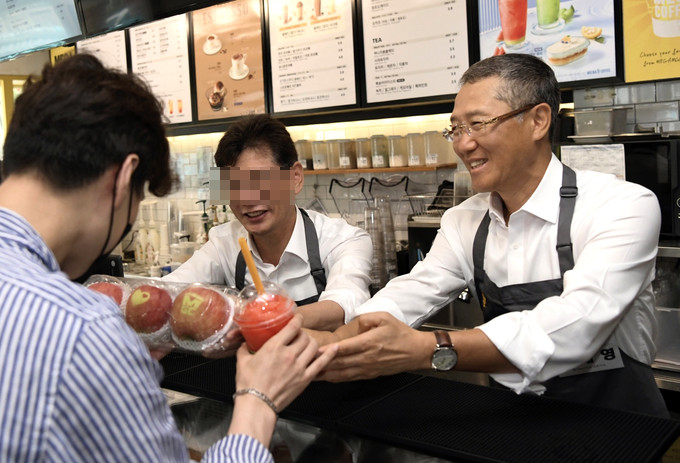 ▲ 일일 점장으로 나선 김대영 메가MGC커피 대표이사(오른) (사진=newsis) |