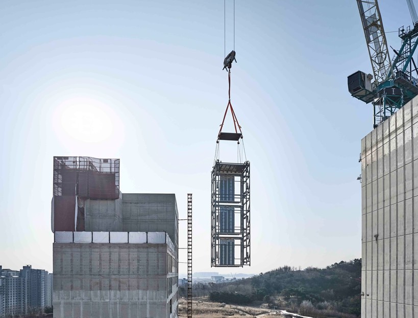 | ▲ 3개 층으로 사전 제작된 이노블록 모듈이 지난달 인천 송도 힐스테이트 센터파크 현장에서 적층되고 있다.(사진=현대엘리베이터) |