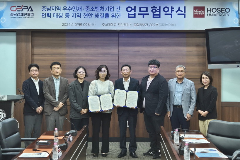 [일요주간 = 조무정 기자] 호서대학교(총장 강일구) 경영대학과 충남경제진흥원이 9일 지역 경제 활성화와 균형 발전을 위해 ‘충남지역 우수인재·중소벤처기업 간 인력 매칭 등 지역 현안 해결’을 위한 업무협약을 체결했다.