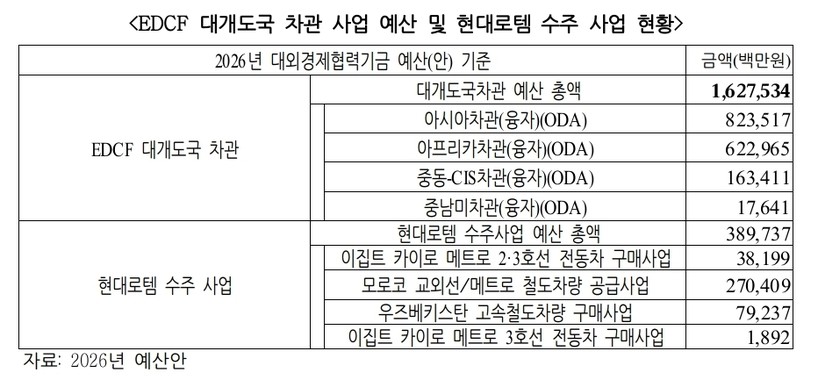 국회 기획재정위원회 소속 조국혁신당 차규근 의원이 21일 공개한 자료에 따르면 내년도 EDCF 총예산 약 2조 3000억 원 가운데 개도국 차관사업 예산은 163개 사업, 총 1조 6000억 원 규모로 편성됐다. 이 중 현대로템이 수주한 단 4건의 사업이 3897억 원으로 전체 차관 예산의 24%를 차지하는 것으로 나타났다.