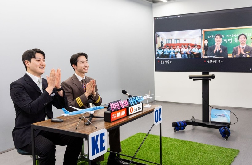 | ▲ 대한항공·아시아나항공 교육기부 봉사단이 지난 27일 오후 서울 강서구 대한항공 본사 스튜디오에서 ‘온라인 직업 특강’을 진행하고 있는 모습(사진=대한항공) |