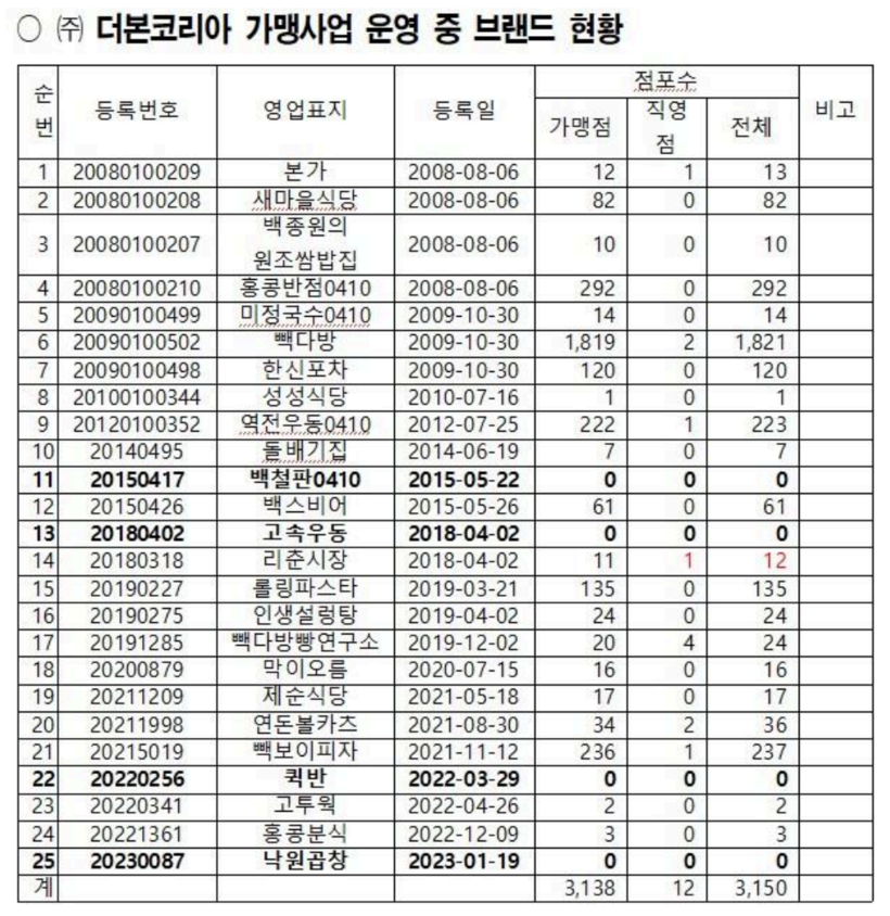 2008년 8월 ‘원조쌈밥집’, ‘본가’, ‘새마을식당’, ‘알파갈매기살’ 등으로 최초 등록 이후 2023년 말까지 총 50개 브랜드의 정보공개서를 공정위에 등록했다. 이 중 절반인 25개 브랜드는 자진 취소됐고 현재는 ‘빽다방’, ‘홍콩반점’, ‘롤링파스타’, ‘고투웍’ 등 25개 브랜드가 운영 중이다.