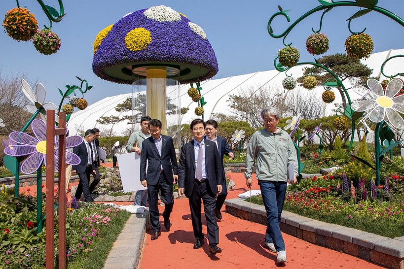 | ▲ 김선규 호반그룹 회장(완쪽에서 두 번째)이 지난 15일 충남 태안군 꽃지해안공원에서 열리는 ‘2026 태안국제원예치유박람회’ 현장을 찾아 개막 전 준비 상황을 직접 점검하고 있다. (사진=호반그룹 제공) |