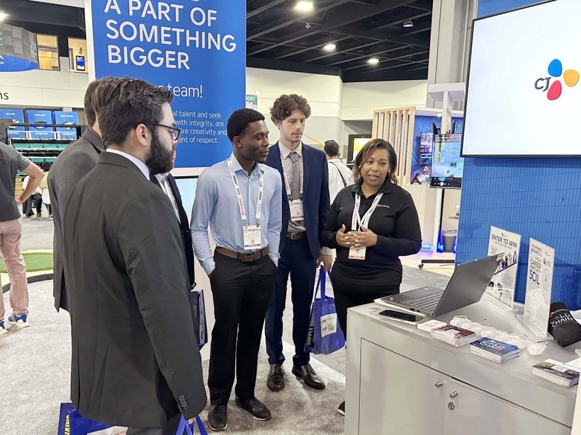 | ▲ CJ대한통운 미국법인 CJ로지스틱스 아메리카(CJLA) 직원이 미국 애틀란타에서 개최된 ‘MODEX 2026’ 참관객들에게 콜드체인 물류 서비스와 AI 기반 물류관리시스템을 설명하고 있다.(사진=CJ대한통운) |