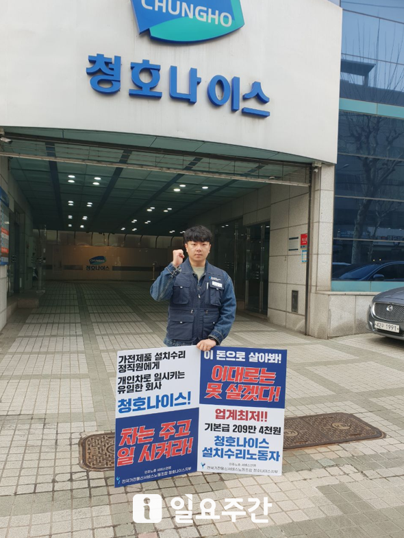 | ▲ 전국가전통신서비스노동조합 청호나이스지부가 지난해 3월 서울 서초구 청호나이스 본사 앞에서 총파업 출정식을 열고 ‘업무용 차량 지급’을 요구하고 있다. (사진=청호나이스지부 제공) |