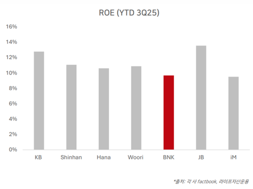 당시 라이프가 분석한 자료에 따르면 BNK금융의 경영 지표는 처참한 수준이다. 자본적정성을 나타내는 보통주자본(CET1) 비율은 12.59%로 7대 금융지주 평균(13.00%)에 미치지 못했고 자기자본이익률(ROE) 역시 최하위권에 머물렀다. 특히 지역 밀착 여신의 부실화로 인해 고정이하여신(NPL) 비율은 1.46%에 달해 7대 지주 평균(0.91%)을 크게 웃돌았다.