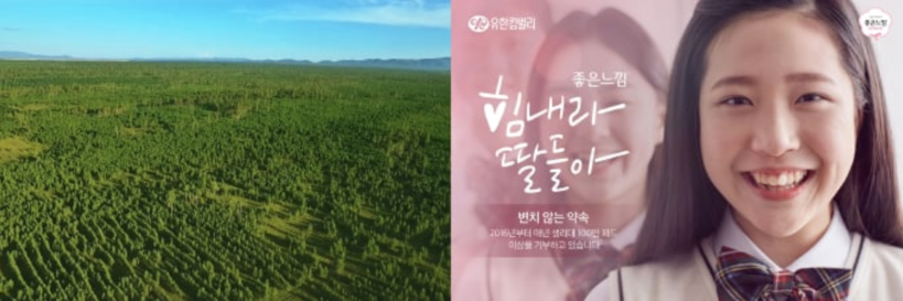 | ▲ <좌> 몽골 유한킴벌리숲 전경 <우> 좋은느낌 힘내라 딸들아 생리대 기부 캠페인. (사진=유한킴벌리 제공) |